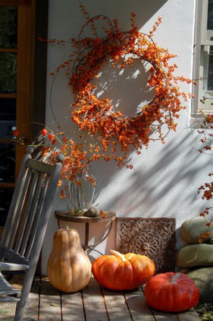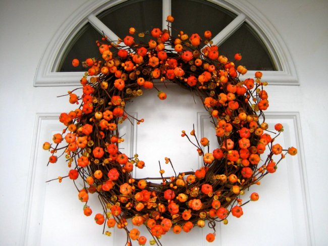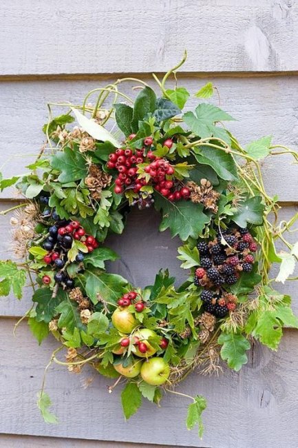 Композиції до свята осені: Вінок з осінніх квітів, листя, шишок, овочів та фруктів (фото)