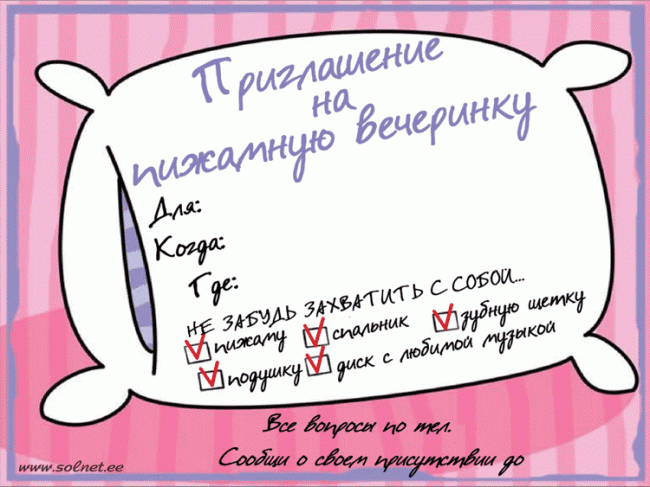 Вечеринка в пижамном стиле, как и любая детская тематическая вечеринка, начинается с пригласительных. Распечатайте и раздайте их заранее. Не забудьте указать дресс-код — удобные пижамы и ночные сорочки. Гостям желательно прихватить также комнатные тапочки и любимую подушку.