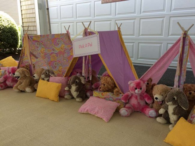 Если ваши гости немного повзрослее, вечеринку можно устроить с расчетом на ночь. Это лучше делать дома. Главные атрибуты праздничного декора — мягкие покрывала и подушки, плюшевые игрушки, раскладные палатки, украшенные огоньками.
