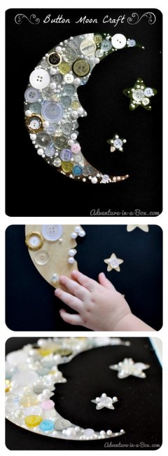 Игры с пуговицами отлично развивают мелкую моторику малышей. Поделки на тему космоса: звезды, луну и даже планеты — также можно украсить пуговичками. Красиво и полезно для малыша!