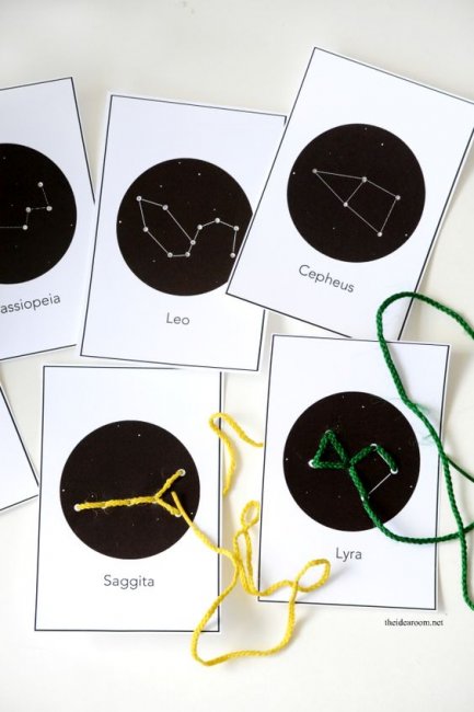 Если вашей крохе очень нравится тема со звездами, отличным вариантом будет игра со шнуровкой и созвездиями. Подготовиться к такой поделке очень просто: выберите несколько созвездий, перерисуйте их точками на картонные листы и проделайте дырочки на месте точек. Задача малыша — соединить все точки шнурочком. Создание такой поделки отлично развивает мелкую моторику рук ребенка.