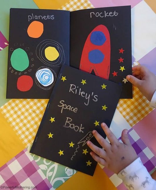 Поделка про космос в виде персональной книжечки, которая всегда будет с ребенком даже в детском садике — хороший вариант, чтобы поддерживать его интерес к теме и повторять с малышом, например, названия планет. А если вы создадите такую поделку из бумаги про космос своими руками вместе с ребенком, куда он сам сможет вклеить планеты, ракеты и даже свою фотку в образе астронавта, польза будет двойная.