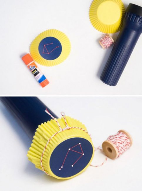 Еще одна идея поделки на тему "Космос", которая поможет ребенка звездами и созвездиями. Скачайте схемы созвездий, распечатайте и повырезайте их по круглому контуру. Выберите нужные схемы, сделайте дырки иголкой в точках созвездий и наклейте их на разные плотные бумажные формы для кексов. Рабочий фонарик накройте одной заготовкой и закрепите ниткой. Теперь вы можете демонстрировать деткам вечером разные созвездия, меняя заготовки, через включенный фонарик.