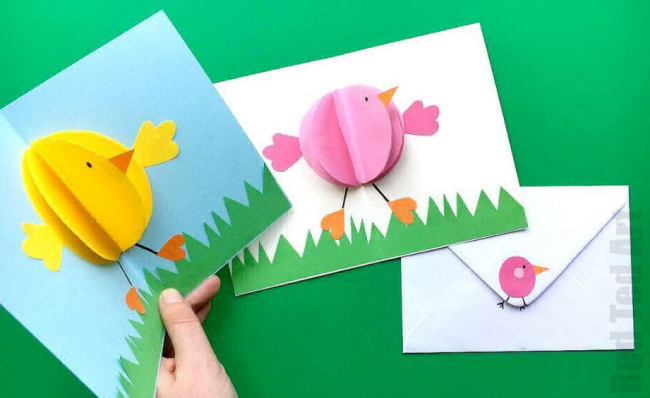 Гарна великодня листівка з паперу з курчатами — зовсім не така складна, як здається на перший погляд. Щоб зробити цю поробку на Пасху своїми руками, дітям знадобляться вирізані з паперу деталі: трава, крильця, ніжки, клювик, та 5-6 однакових кругів для тулуба. Щоб зробити його складіть круги навпіл, а потім зклейте половинки по черзі одна до одної, залишивши не зклеєними — дві останні, які треба буде прикріпити до основи листівки.