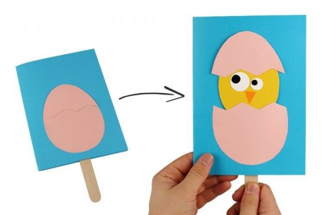 Виріжте з паперу деталі: великий овал — майбутнє яйце, та розділіть його навпіл. Також виріжте овал поменше — майбутнє курча. Приклейте нижню частину яйця до основи по периметру. А верхню — до голови курча. Знизу до курчатка треба прикріпити паличку від морозива. І зробити невеличку дірочку в картоннній основі так, щоб її не будо видно за нижнью частиною яйця. Тепер з'єднайте обидві частини поробки. Все. Можна гратися.