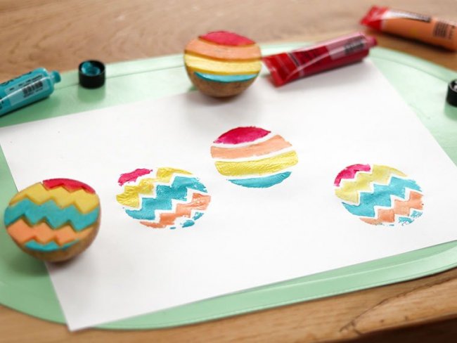 Дуже веселий виріб на Великдень — робимо принти картоплею. Для цього треба розрізати картоплину навпіл, а потім вирізати візерунки на зрізах. І цим "штампом" робимо принти писанок.