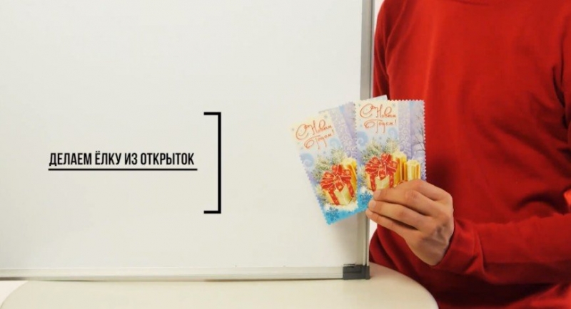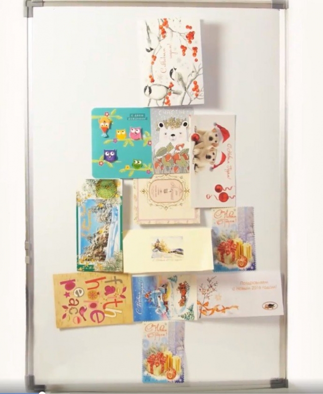 Ёлка из открытокВам понадобятся праздничные новогодние открытки. Перетряхните семейные архивы, выберите 20-30 самых красивых — это как раз столько, сколько нужно. Основой для будущей ёлки может стать стена или флип-чарт.