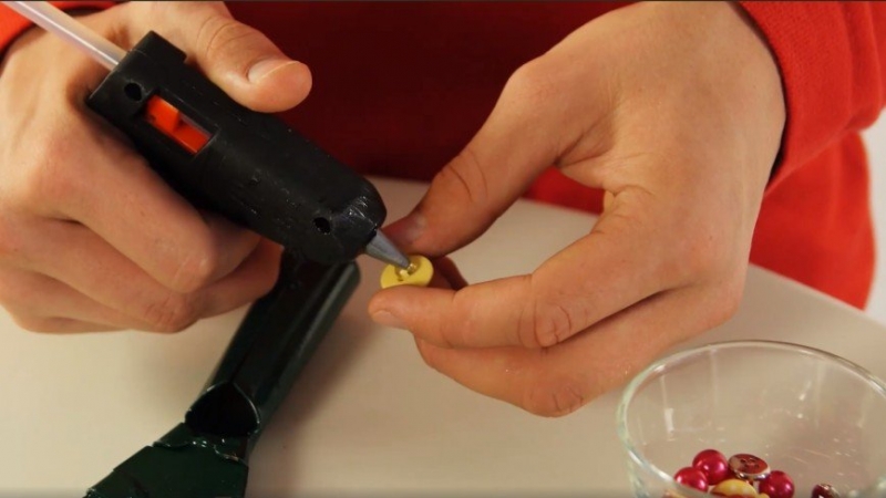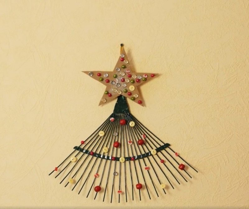 Клеевым инструментом приклеиваем на будущую ёлку украшения и яркие плоские пуговицы. Сверху приклеиваем звезду, которая замаскирует место прикрепления грабель к черенку.