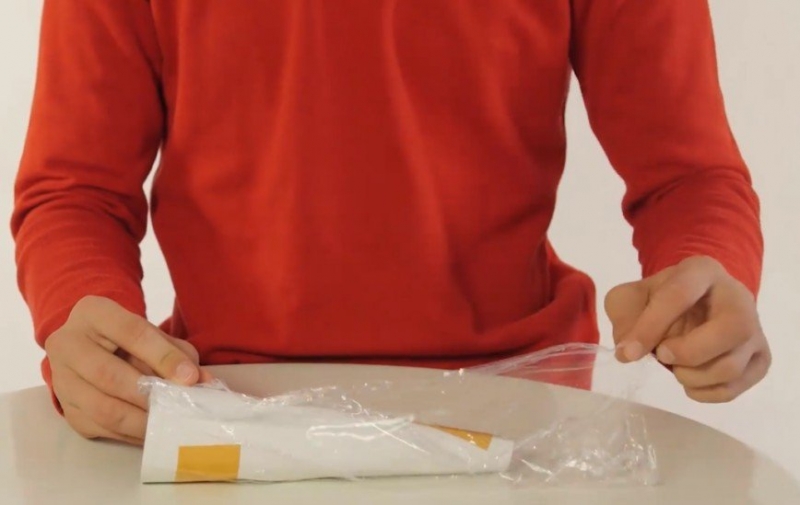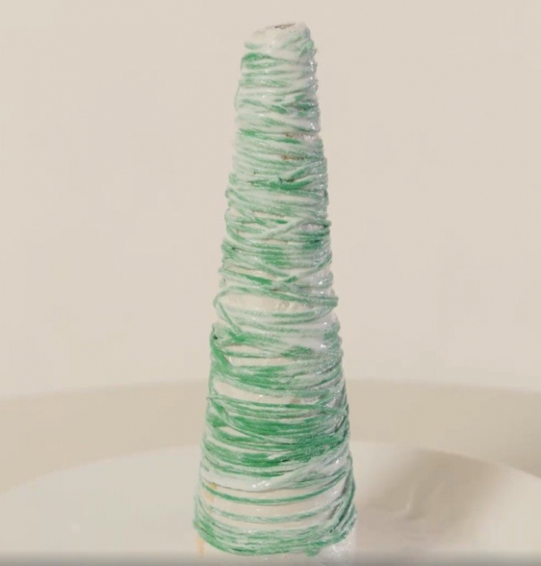 Сворачиваем лист в виде конуса и сворачиваем его так, чтобы конус получился устойчивым. Для того, чтобы извлечение ёлочки из готового конуса было максимально удобным, нужно обмотать его пищевой плёнкой. Далее пропитываем нитки в клее ПВА и обматываем ими бумажную заготовку.