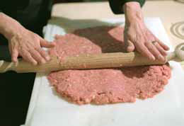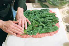 - Припустить пару минут в кипятке листья шпината, откинуть на дуршлаг и дать стечь воде. На большой лист бумаги для выпечки выложить мясной фарш и раскатать скалкой в прямоугольник толщиной примерно 1 см.