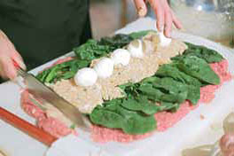 - Сверху посередине вдоль длинной стороны выложить куриный фарш полосой примерно 12 см. Выложить сверху очищенные вареные яйца. Подровнять мясо по сторонам.