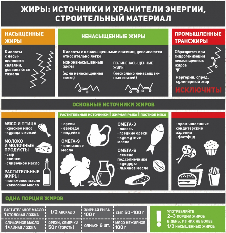 Жиры — один из важнейших компонентов пищи. В течение дня человеку нужно включать в рацион максимум 65 г жиров, не больше. Это 3 порции, из них 1/3 порции — это насыщенные жиры.
