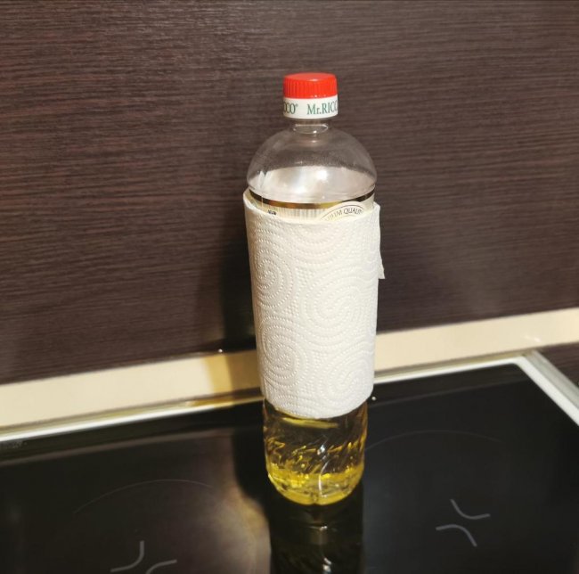 Для защиты от масляных подтековВсем, кто регулярно готовит салаты с оливковым или подсолнечным маслом, известно о его пачкающих свойствах. Даже закрытая бутылка с маслом может испортить вид столешницы или полки. Чтобы сама бутылка и все окружающие поверхности не были в масляных каплях, достаточно сложить бумажное полотенце, отделенное от рулона, в 2-4 раза, обернуть вокруг бутылки и закрепить резинкой. Таким образом, ничего не будет проливаться. Кроме того, бутылка не выскользнет из рук.