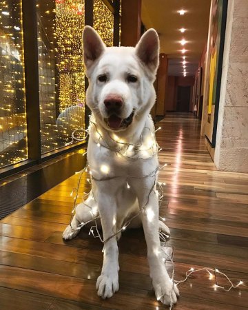 У популярной певицы Глюкозы, смело шагающей в начале своей карьеры по сцене с доберманом на поводке, живет чудесная белая собака, ставшая настоящей звездой телевизионного шоу «Вечерний Ургант», в студию которого его привела звездная хозяйка.