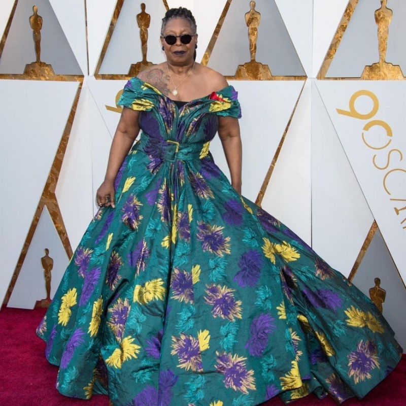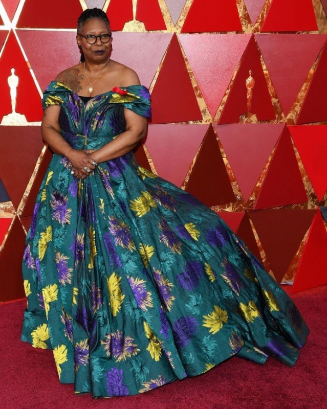 Прославленную актрису Вупи Голдберг почитают за многие таланты, в том числе и за смелость оставаться собой. Так, на красной ковровой дорожке кинопремии "Оскар-2018" звезда продемонстрировала одно из самых заметных и необычных платьев, мгновенно приковав к себе все взгляды. Для вечера Вупи сделала ставку на пышное платье от Christian Siriano цвета морской волны с большим цветочным орнаментом, имеющим сходство с узорами гобелена.