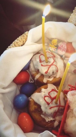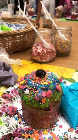 На свой вкус украшает пасхальную выпечку и Стефания Маликова, щедро выложив на верхушку кулича разноцветную кондитерскую присыпку.