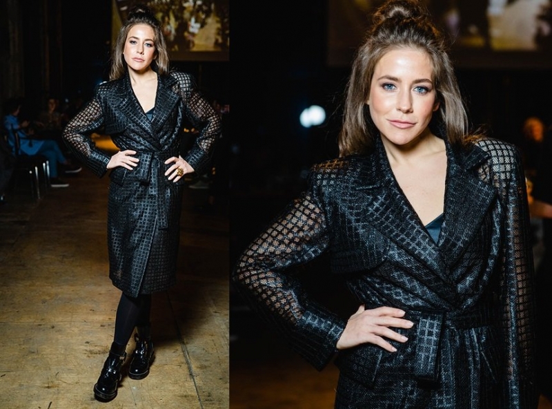 Для публичного выхода Юлия выбрала довольно необычный наряд. Девушка появилась на показе в черном пальто с прозрачными рукавами и парой накладных карманов. Завершила ведущая свой довольно мрачный образ лакированными ботинками на толстой подошве и небрежной укладкой волос.