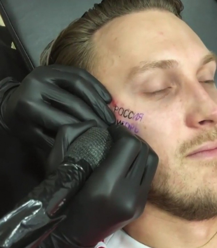 Мужчина пошел на такой рискованный шаг, не подозревая, что все обернется вот так: победа России не оставила ему других вариантов, кроме как отправиться в салон тату. При этом, как настоящий патриот, держа в голове мысль о несмываемой надписи на лице, он все равно болел за российскую сборную и надеялся на триумф.