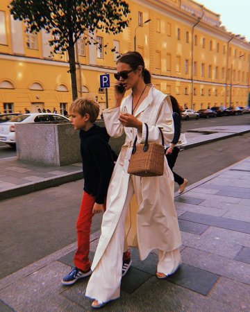 На снимке Водянова говорит по телефону, прогуливаясь с сыном по центру Москвы. На ней красуется светлый костюм, состоящий из длинных широких брюк и легкого плаща с длинным рукавом. Сумка-корзина на руке, зачесанные в хвост волосы и темные очки дополнили уличный стиль звездной модели. Они же, видимо, и сделали ее похожей на супругу Дэвида Бекхэма, которая часто укладывает волосы именно так, а с темными очками растется крайне редко.