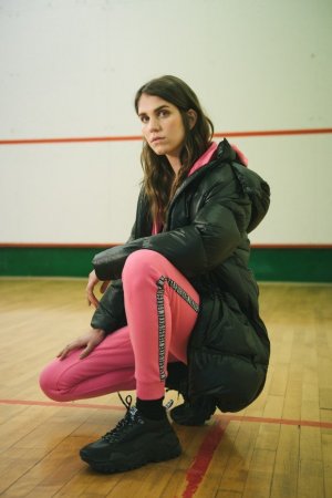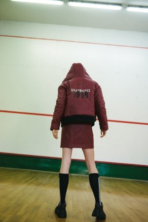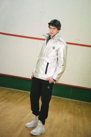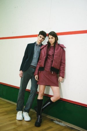 УлицаЧерные вещи с флуоресцентными штрихами и бликами воскрешают в памяти атмосферу хип-хоп вечеринки. Универсальная мужская коллекция состоит из нейлоновых бомберов, кожаных курток, тренировочных брюк, футболок и толстовок с дерзкими надписями. Женская коллекция – это костюмы из плюша, укороченные пуховики, мохнатые свитеры и грубые кроссовки на платформе, идеально сочетающиеся с гетрами.