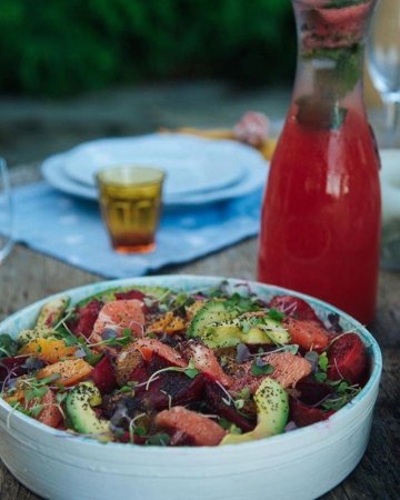 instagram.com/marikakravtsova/ Ингредиенты: Салат:?1-2 авокадо?2 запеченных свёклы (можно замариновать)?1 грейпфрут, разобранный на сегменты?1 апельсин, разобранный на сегменты?Семена мака для красоты (можно чёрный кунжут)?Микрозелень (или любую вашу любимую зелень)?Заправка:?2 ст. л. апельсинового сока?1 ст. л. сока лимона?2 ст. л. любимого растительного масла?2 ч. л. кленового сиропа?Соль, перец по вкусу Процесс приготовления: Порезать овощи, как вам нравится, разложить апельсин и грейпфрут, полить сверху заправкой и посыпать микрозеленью. Заправку лучше смешать отдельно.