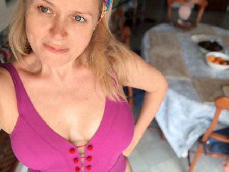 На фото Анна позирует в розовом купальнике с кокетливыми красными помпонами на шнуровке, которая едва сдерживает эффектную грудь.