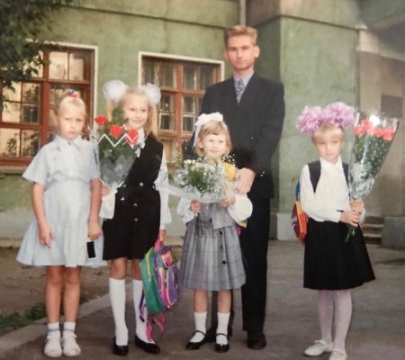 Анна Цуканова-Котт: «На фото я, папа и подружки. Идем все дружно в первый класс! Папа, конечно, для поддержки. Вроде было совсем недавно, а реально столько всего хорошего произошло за эти годы! Что бы я сказала себе, той первокласснице с бантиками? Сказала бы — ничего не бойся и действуй, у тебя всё получится, тебя ждёт впереди много всего интересного, это твой правильный путь!»