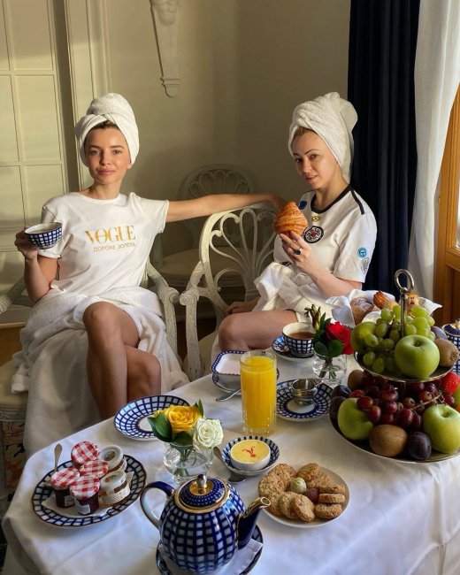 Яна Рудковская отправилась в Санкт-Петербург без супруга и сына, чтобы посетить спектакль и модный показ, а заодно встретилась с подругой. Из-за плотного графика продюсера они решили устроить чаепитие в номере отеля, где остановилась Яна. По традиции знаменитость решила поделиться с подписчиками снимком своего завтрака. На фото, которое Яна опубликовала в микроблоге, она предстала в неожиданном для подписчиков виде: продюсер запечатлена без макияжа, волосы убраны под банное полотенце, а вместо роскошного наряда она сфотографировалась в белой футболке и завязанном на талии халате.