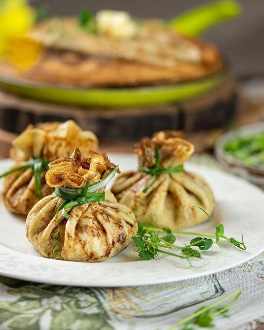 Заварные блины на молоке с начинкой из курицы Ингредиенты:Блины: 3 яйца50 гр (3 ст. л.) сахара4 гр (1/3 ч. л.) соли1/2 ч. л. соды1/2 ч. л. сока лимона600 гр молока50 гр растопленного сливочного масла30 гр растительного масла300 гр муки300 гр кипятка Начинка: 500 гр мякоти курицы200 гр зеленого замороженного горошка150 гр сливок1/3 стебля лука-порея1 ст. л. мукиперья зеленого лукапророщенный горох (для украшения) Заварные блины на молоке с начинкой из курицы Процесс приготовления: 1. Взбить яйца с сахаром и солью венчиком, влить 300 гр молока, перемешать, добавить половину муки и все перемешать тщательно. 2. Оставшееся молоко нагреть до 60 градусов и влить в тесто. Перемешать. Добавить оставшуюся муку, масло и соду, гашенную соком лимона. Все перемешать. В конце добавить 300 гр кипятка и снова перемешать. Тесто должно получиться жидким. Выпекать блинчики на разогретой сковородке (диаметр 22 см) с двух сторон до готовности. В процессе можно добавлять немного воды, чтобы блинчики были тонкие. Смазать готовые блинчики сливочным маслом. 3. Курицу мелко порезать, потушить с луком-пореем на смазанной оливковым маслом сковороде, добавить соль и специи по вкусу, добавить горошек и влить сливки, потушить все около 20 минут. Можно добавить ложку муки для густоты соуса. 4. Начинить блинчики, сделать их в виде мешочка, завязать перьями зеленого лука, украсить ростками горошка.