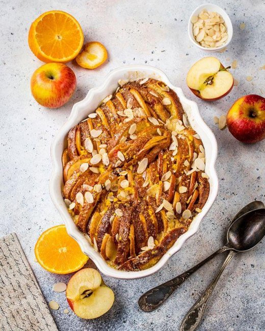 Berrington 19-апр, 14:09 945Ингредиенты:• кулич черствый (желательно снять глазурь) 400 гр• сливки 10% (можно молоко) 400 мл• яйцо куриное 140 гр (2 шт СО)• сахар 70 гр• крахмал кукурузный 15 гр• соль щепотка• ванильная паста 1 ч. л.• сливочное масло 100 гр• яблоки кисло-сладкие 250 гр• апельсиновая цедра 30 гр• ром/коньяк/бальзам 1 ст. л.• миндальные лепестки• специи (по желанию, кардамон, корица, мускатный орех) 1 ч. л.• 1 ч. л. сахара для декора