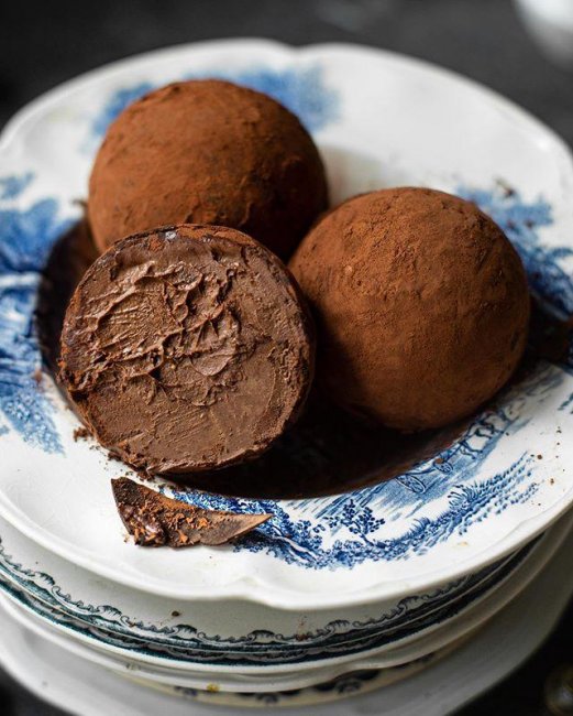 Автор фото и рецепта Олеся Куприн: Ингредиенты: 270 мл жирных сливок 330 гр темного шоколада 75P гр сахарной пудры50 гр сливочного масла140 рг творожного сыра Если хотите сделать десерт в форме шаров: Шоколад для силиконовых формКакао для обсыпки Процесс приготовления: 1. Сливки соедините с сахарной пудрой, перемешайте. Доведите до медленного кипения, снимите с огня, добавьте шоколад, дайте постоять 1-2 минуты и тщательно перемешайте.2. Добавьте творожный сыр комнатной температуры, снова вымешайте до однородности, а затем размягченное сливочное масло, и опять перемешайте.3. Готовый мусс распределите по креманкам и уберите на 2-3 часа в холодильник.4. Если хотите сделать его в виде муссового десерта, как на фото, то предварительно растопите шоколад для смазывания формы, смажьте им силиконовые формочки и охладители их в морозилке. Затем наполните половинки муссом и уберите в морозилку, на 3-4 часа (точное время зависит от вашего холодильника). Готовые половинки выньте из формы и соедините между собой плотно прижав их друг к другу. Обваляйте полученные шары в какао, дайте им постоять 20-30 минут при комнатной температуре и подавайте.