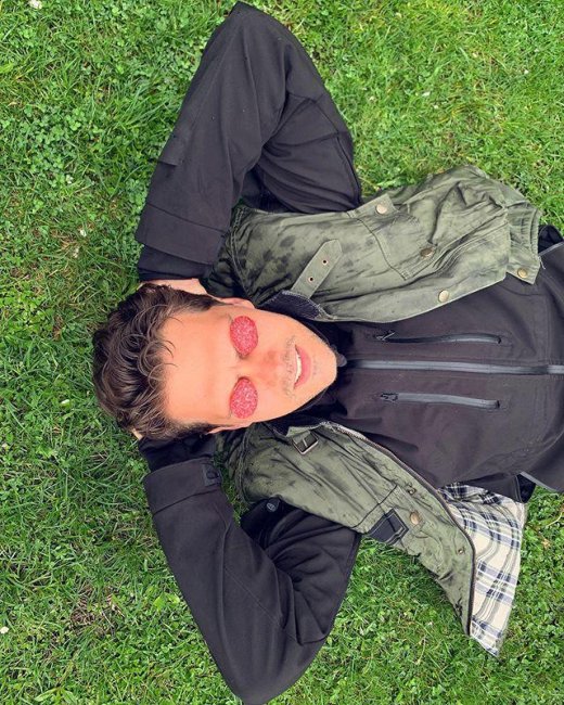 Видимо, избранницы Биковича не ценили его чувство юмора, а им-то он славится. Несколько часов назад артист опубликовал забавное фото. Он изображен лежащим на газоне в спортивной куртке и жилете защитного цвета, руки актер положил под голову, а глаза прикрыл кусочками сырокопченой (судя по виду), колбасы.