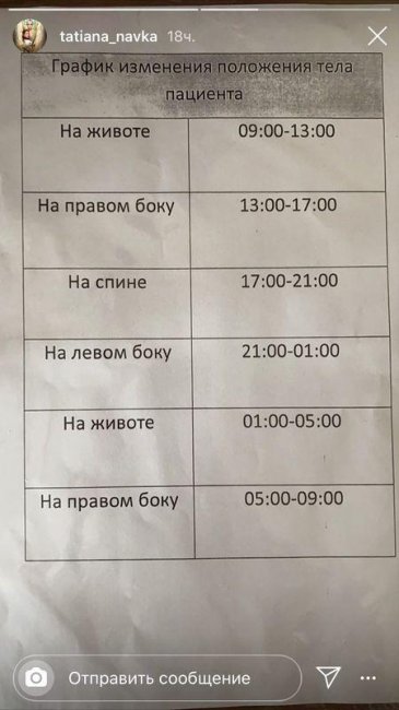 Сейчас муж и жена проходят лечение в одной из столичных клиник. Снимками из палаты несколько часов назад Татьяна поделилась в Stories Инстаграма. На одном из фото запечатлен букет любимых цветов фигуристки — пионов, на другом — график перемены положения тел для заболевших коронавирусом: такой режим исключает отдых на спине, чтобы не допустить скопления мокроты в легких, кроме того, предотвращает образование пролежней.