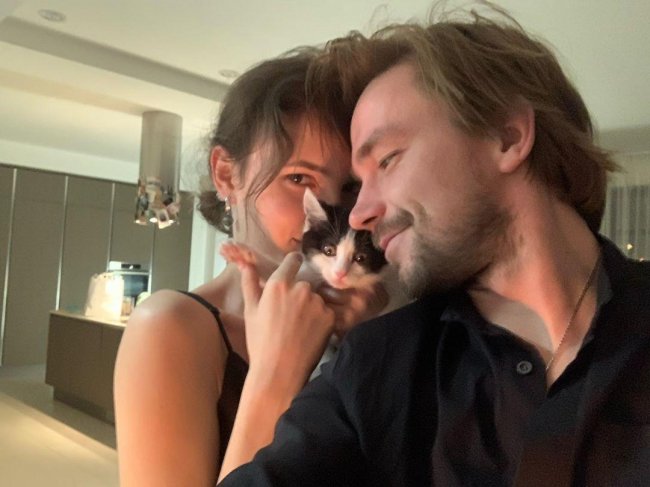 Сегодня актер опубликовал трогательный кадр, на котором запечатлена вся его маленькая семья: Саша на снимке нежно склонил голову к избраннице, которая держит на руках черно-белого котенка.