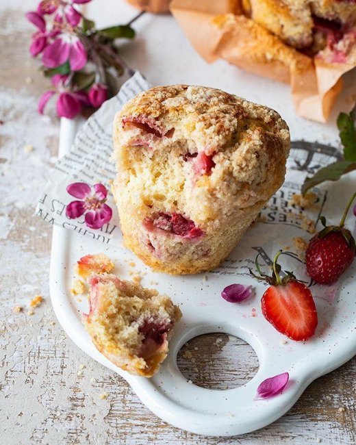 Автор фото и рецепта Агния: instagram.com/mykitchenrulez/ Ингредиенты:Для хрустящеи крошки: • 100 г сахара• 100 г муки• щепотка корицы• 110 г холодного сливочного масла? Для маффинов: • 420 г муки 2 ст ложки• 3 ч. л. разрыхлителя• щепотка корицы• щепотка соли• 110 г сливочного масла комнатнои температуры• 250 г сахара• 1 большое яицо 2 больших желтка• 1 ч. л. ванильного экстракта• 240 мл молока• 260 г клубники Процесс приготовления:1. Для крошки масло, сахар, корицу и муку поместить в большую миску, либо в чашу миксера, и либо пальцами, либо насадкои-веслом перетереть тесто в крошку, размером с горох. Убрать пока в холодильник.2. Духовку разогреть до 175С. В миске смешать муку, соль, корицу и разрыхлитель. Масло взбить с сахаром в пышную светлую массу, затем добавить ванильныи экстракт, затем яицо и желтки, каждыи раз тщательно вымешивая. После всыпать в масляную смесь муку в то приема, чередуя с молоком, перемешать до объединения всех ингредиентов. 3. Клубнику очистить и порезать на четвертинки, после смешать порезанную клубнику с 2 ст. л. муки и вмешать в тесто.4. Заполнить формочки для маффинов тестом чуть меньше, чем на 3/4, посыпать каждыи маффин 2 ст. л. крошки и выпекать 20-25 минут, в зависимости от духовки. Готовность проверяем деревяннои палочкои, она должна выходить полностью сухои.