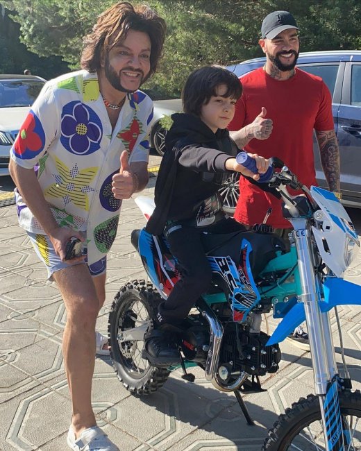 Филипп Киркоров с детьми Сыну Филиппа Киркорова 29 июня исполнилось восемь лет. Певец решил порадовать мальчика грандиозной вечеринкой в стиле любимых Мартином «Звездных войн». Сам именинник предстал перед гостями в костюме главного злодея саги Дарта Вейдера. На вечеринке собрались многие знаменитости. Вместе с сыном пришел Сергей Лазарев, младшую дочь он пока не берет на светские мероприятия. Филипп Киркоров с Тимати и сыном На фото, которые опубликовал Филипп, можно увидеть и других знаменитых гостей: Ани Лорак с дочерью, Андрея Малахова, Яну Рудковскую, Юлию Барановскую в компании всех наследников. Но самым запоминающимся стало появление рэпера Тимати. Несмотря на то что несколько лет назад артисты находились в конфликте, сейчас они дружат и поздравляют друг друга с праздниками. На этот раз рэпер преподнес Мартину по-настоящему роскошный подарок — мотоцикл. Филипп Киркоров Мальчика сразу посадили на новое транспортное средство и позволили прокатиться в компании специалиста, а затем и самого Тимати. Этот презент поразил Филиппа, в Stories он признался, что был шокирован выбором Тимати, но сам Мартин остался от презента в полном восторге.