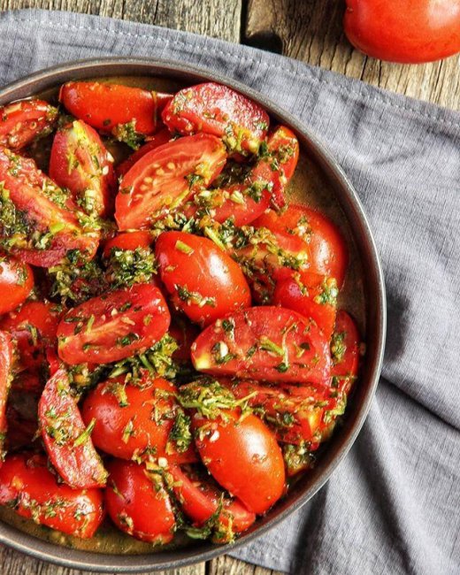 Автор фото и рецепта Марина Баранова: instagram.com/marina._.baranova/ Ингредиенты: Помидоры 1 кгКрасный сладкий перец 2 штОстрый перец 1/2 среднегоЧеснок 5-6 зубчиковМасло растительное 50 млУксус 9% 50 млСахар 3 ст.л.Соль 1 ст.л.Зелень (укроп и петрушка) пучок Процесс приготовления: 1. Помидоры вымыть и нарезать на 4 части. Перец, зелень и чеснок измельчить (можно блендером). 2. Из масла, уксуса, сахара и соли сделать маринад (не кипятить, просто перемешать).3. Сложить помидоры в кастрюлю, добавить смесь зелени, чеснока и перцев, маринад. Все перемешать, накрыть крышкой и убрать в холодильник. 4. Через сутки помидоры готовы. Особенно вкусно на третий день.