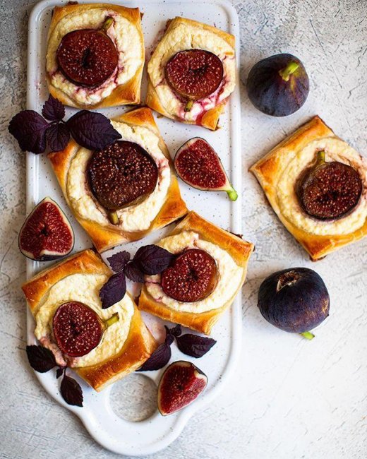 Ингредиенты:?500 г готового слоеного теста?200 г творога?100 г греческого йогурта?70 г сахара?1 яйцо?9 шт свежего инжира