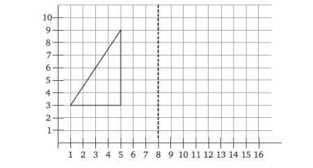 Л. Изображенный на рисунке треугольник с координатами вершин (1,3), (5, 3), (5, 9) отражен относительно пунктирной линии. Одна из вершин отраженного треугольника находится в точке с координатами (11, 3). Каковы координаты двух других его вершин?