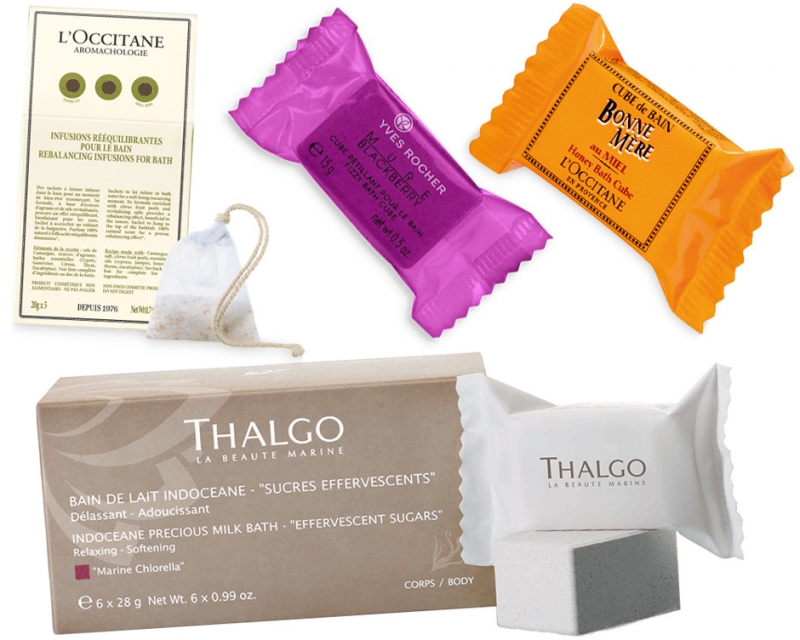 Саше для ванны Aromachologie, L'Occitane; кубики для ванны Mure Blackberry, Yves Rocher; Bonne Mere au Miel, L'Occitane; Effervescent Sugars, Thalgo.Еще два жанра приятных мелочей для ванны — шипучие кубики и саше.