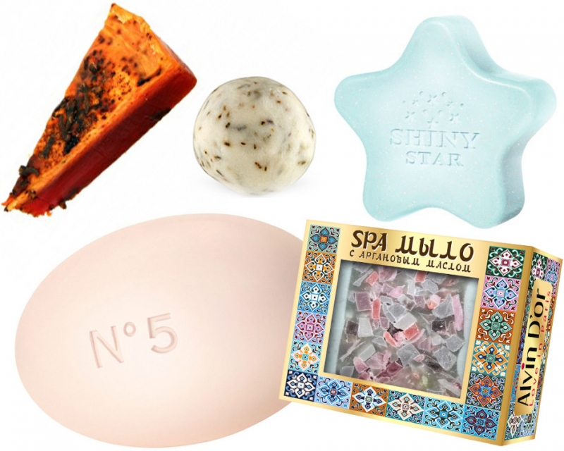 Мыло: «Тыквенный пирог», Shik Halal; #5, Chanel; «Кедровое», Natura Siberica; Shiny Star, Oriflame; Spa-мыло с аргановым маслом, Alvin d'Or.Скраб