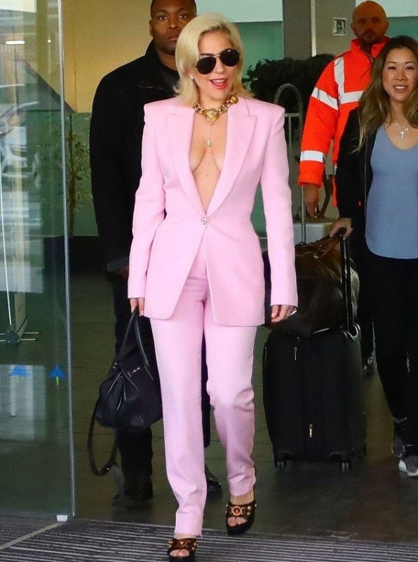 Леди Гага прибыла в аэропорт Барселоны в четверг в преддверии своего Европейского турне. В ярком розовом брючном костюме от Версаче, надетом на голое тело и застегнутом на одну пуговицу, певица потрясла видавших виды репортеров. Ее странный наряд дополняли такие же странные солнцезащитные очки, которые почему то были перекошены.Появившиеся в соцсетях фотографии с удовольствием обсудили фанаты и критики. Многие отметили, что грудь Гаги выглядит неидеальной и нужно быть очень смелой женщиной, чтобы ее демонстрировать. Очки, по мнению подписчиков, выглядят так, будто певице дали пощечину. Да и сама она выглядит уставшей и постаревшей.