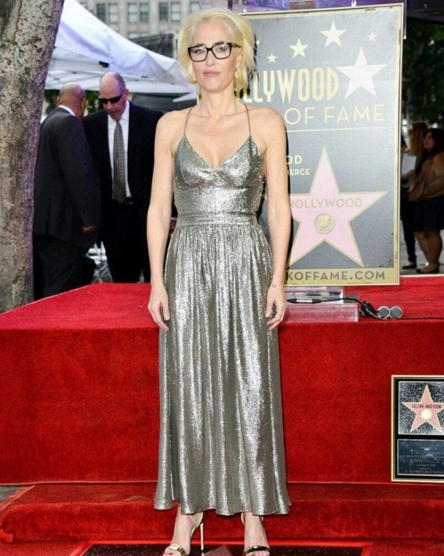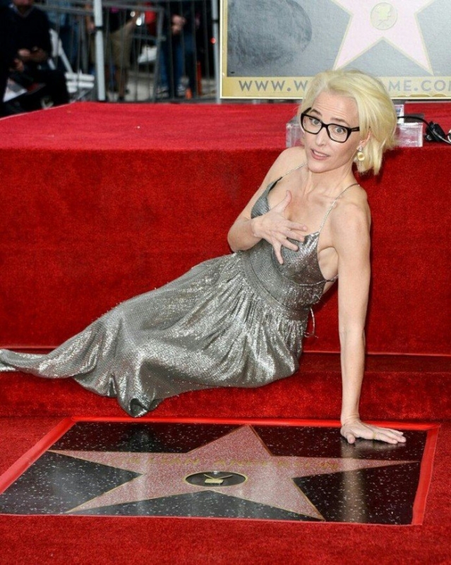 Актриса Джиллиан Андерсон, известная по роли спецагента Скалли в сериале «Секретные материалы», получила, наконец, звезду на голливудской Аллее славы. Но для этого торжественного мероприятия женщина выбрала неудачный образ. Получение собственной звезды — мероприятие очень почетное, актеры мечтают об этом. Имея за плечами целый ряд блестящих ролей, Джиллиан во время своей благодарственной речи отметила именно создателей сериала «Секретные материалы», которые дали ей путевку в жизнь.Коллеги по сериалу Дэвида Духовны на открытии звезды не было, но он заочно поздравил актрису. При этом у Дэвида уже имеется звезда и она, по совпадению или нет, находится недалеко от звезды Андерсон. Джиллиан выбрала для вручения памятной таблички и открытия звезды в Голливуде светлое блестящее платье с откровенным декольте и тонкими бретельками. При этом актриса опрометчиво не надела бюстгальтер, из-за чего чуть было не попала в неловкую ситуацию, когда присела позировать со своей звездой. Она вовремя спохватилась и перестала наклоняться, а также придержала рукой верх платья. Странным кажется также то, что Джиллиан была в одном платье, хотя одежда мужчин рядом выдает холодную погоду. Не оценили в сети и выбор актрисой очков.«Ужасные очки! Они старят ее лет на 10»«Ужас, она изменилась»«Платье ужасно её портит»«Ей не идёт белый цвет волос»«Что за цвет волос? Какой-то желтый, ужас»«Вроде полуголая — старалась показать себя, и такие очки. О чем она думала?» Интернет-пользователи согласились в одном — звезду актриса заслужила. А вот фигуру ее еще недавно все хвалили. Актриса продемонстрировала хороший пресс, отметили и форму ее груди. Дана Скалли уже не та: 48-летняя Джиллиан Андерсон резко постарела Актриса сериала «Секретные материалы» Джиллиан Андерсон приняла участие в съемках новой комедийной видеоверсии инструктажа по безопасности на борту самолета авиакомпании British Airways. В глаза сразу бросилось то, как сильно постарел любимый мужчинами