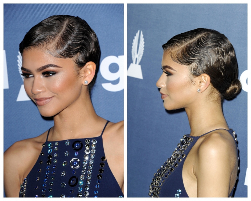 ЗендеяВ Голливуде все не улягутся страсти по поводу так называемых пальчиковых волн, популярных в 20—30-е годы прошлого столетия (о них и поведал когда-то фильм «Великий Гэтсби»). Сейчас история о том, что необязательно сильно стричь волосы, чтобы создать видимость коротких волос — убери все лишнее в пучок. А сами волны создавай с помощью зажимов (закрепляй пряди в форме буквы S) и не жалей лака.