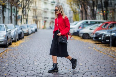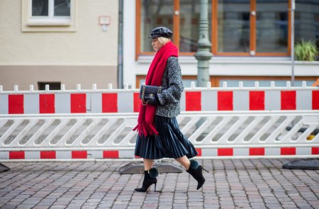 С плиссированной юбкой, ботильонами на шпильке, кепкой и контрастным шарфом