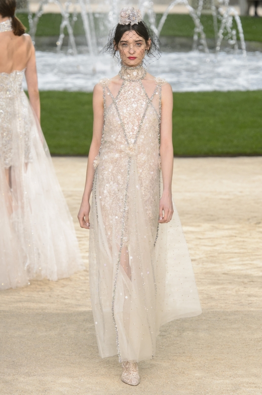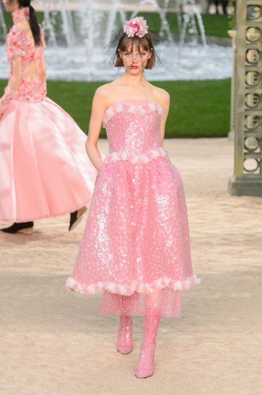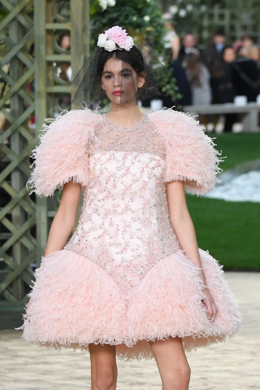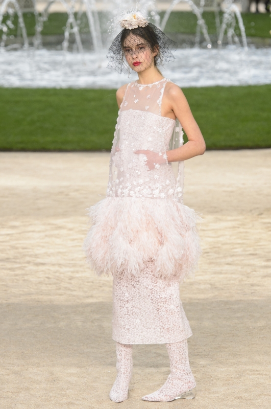Видимо, устав от безумных шоу со взлетающей ракетой или водопадами в полную величину, Лагерфельд вернулся к классике: на этот раз Гран-Пале превратился в гигантский цветник. Тема весны и цветов продолжилась и в коллекции: костюмы были выполнены в пастельных оттенках, а вместо шляпы каждая модель несла конструкцию из бутона и вуали.