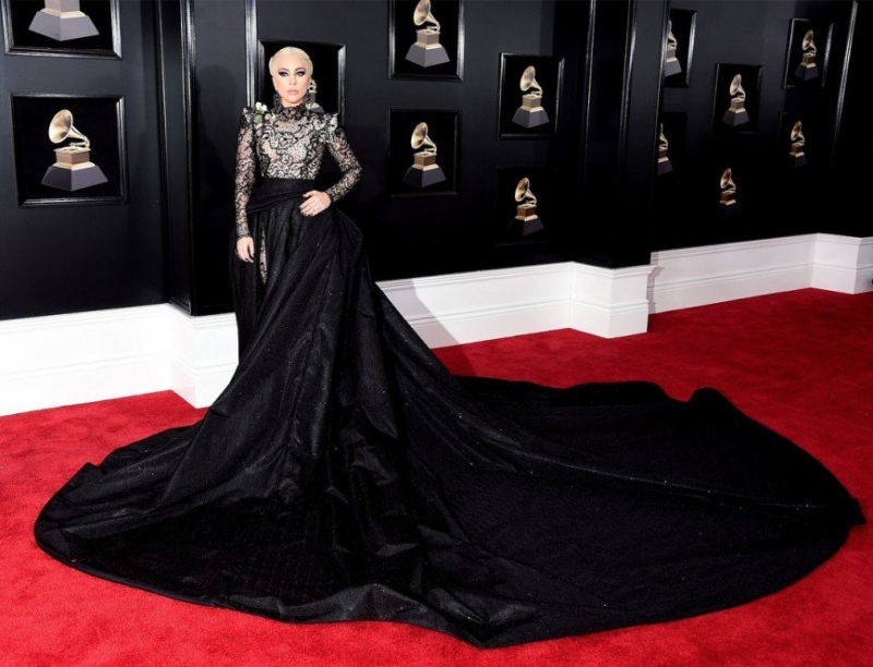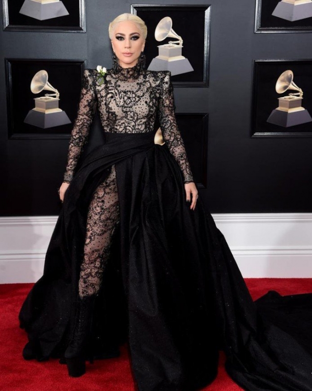 Похоже, времена нелепых нарядов кислотных оттенков и откровенной демонстрации округлостей прошли, уступив место кутюрным туалетам. Появление Леди Гаги на дорожке произвело неизгладимое впечатление на публику, поскольку позировала певица в потрясающем платье от Armani Prive, представлявшее собой чёрный кружевной комбинезон, скрытый под пышной юбкой с просто гигантским шлейфом.
