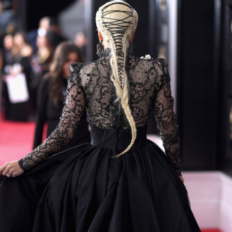 Особо выделить необходимо и прическу Леди Гаги. Парикмахеры возвели на ее голове настоящие произведение искусства из плетения и черного шнурка, что выглядело очень эффектно!