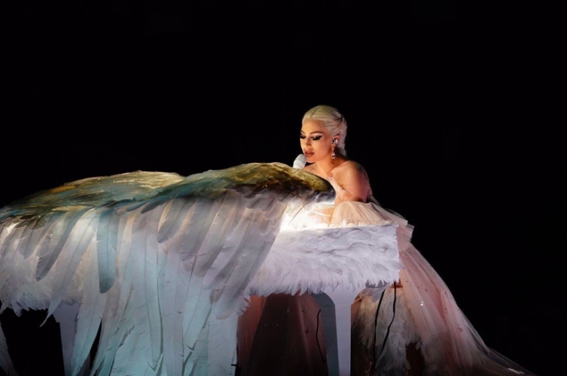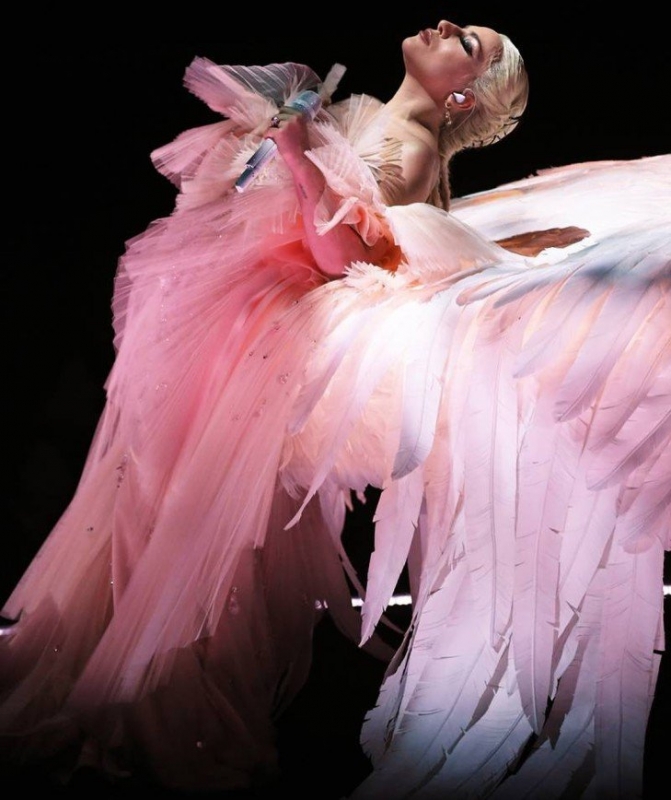 Номер Леди Гаги тоже не остался незамеченным. Во время выступления на сцене звезда сменила драматический костюм, представ в нежном розовом платье с рюшами. Ее выступление было признано одним из лучших благодаря ангельскому образу вокалистки, исполнившей свою песню за белым роялем с огромными крыльями.