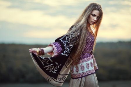 Этно. На ткани часто присутствуют орнаменты, а в качестве аксессуаров используются необычные по внешнему виду украшения.